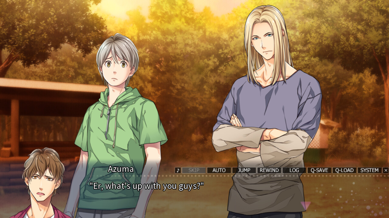 Paradise is a Boys Love visual novel and tells the story of a group of men who go on holiday on a deserted island. When things begin to go wrong, they realize to their horror that they are stranded. Turns out that’s only the start of their problems.