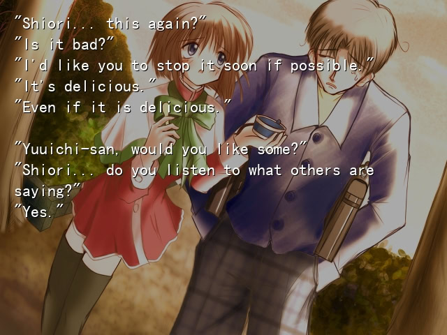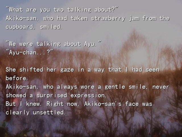 A continuation of Shiori Misaka’s storyline in Kanon. It expands on their relationship as they attempt to figure out what happened to Ayu Tsukimiya.
