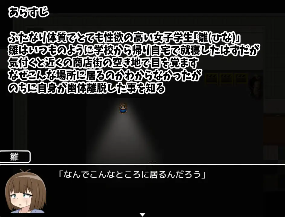 Hina is a female student with a hermaphrodite constitution and a very high sex drive. Hina returns home from school at night as usual and goes to sleep at home, but wakes up in a vacant lot in a nearby shopping district. She doesn’t know why she’s in such a place, but later finds out that she has had an astral projection.