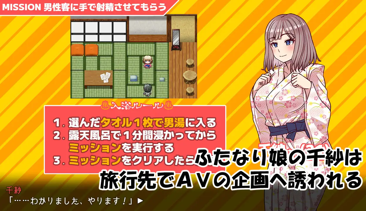 Kyuubi Software has turned the popular doujinshi and book-published masterpiece “Futanari Girls in the Men’s Bath Mission” by Yuuji Kurenai into a game! This latest installment is the “Chisa-san (21)” story.