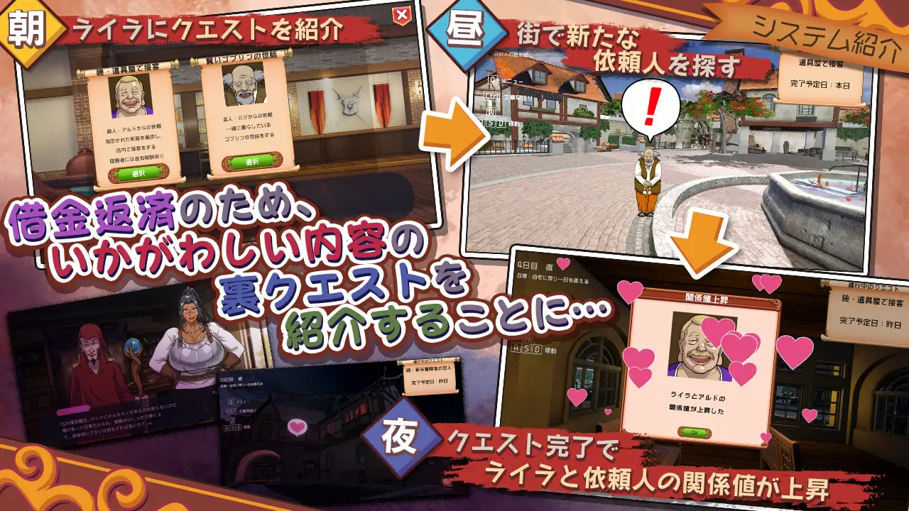 The protagonist (player) works as a receptionist at the Adventurer’s Guild in Central City, the capital of the Kingdom of Nutras. Two years ago, he married a female swordsman named Lyra, who was an adventurer at the time, and they were living a peaceful life together.