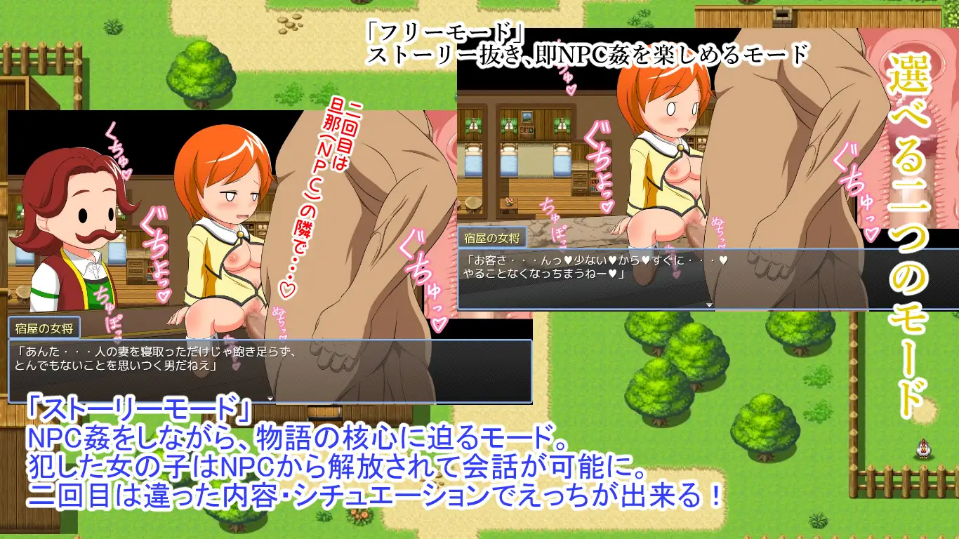 To save the NPCs and to return to the original world, Mobeo goes around raping the girls in the village…