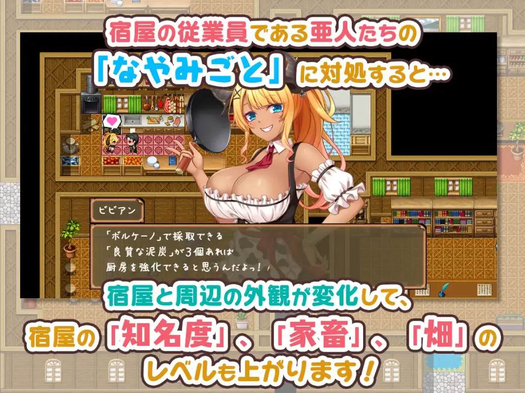 The cow-type beastman Vivian is in charge of cooking and also stocking ingredients.